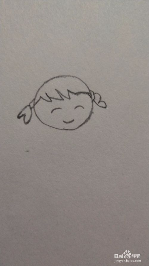 如图,首先画出女孩圆圆的脸蛋,微笑着的眼睛和嘴巴。