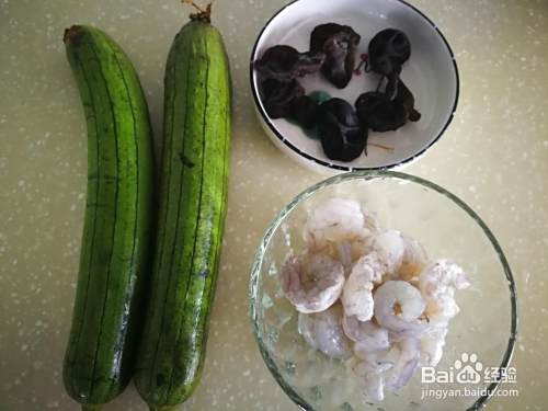 准备2根丝瓜,木耳几片,提前泡发,适量的虾仁,这是市场处理好的虾仁。