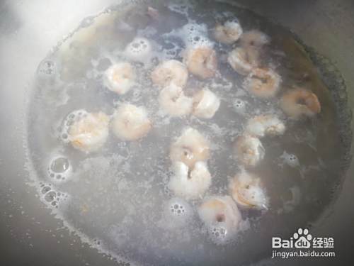 锅中添水烧开,把虾仁入水焯一下,保持其形状,过凉备用。