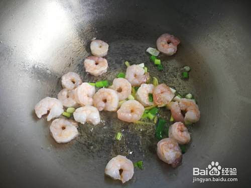 锅中倒入适量橄榄油,微热,葱姜爆锅,先放入虾仁煸炒。