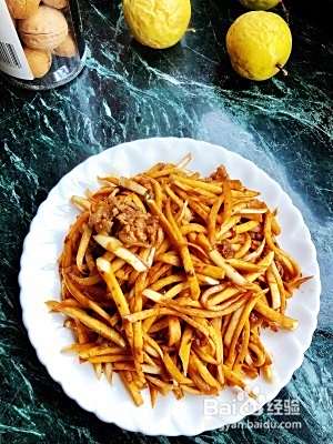 加入茭白丝,一勺豆瓣酱,中火继续翻炒,期间多次添加少量热水防止干锅。