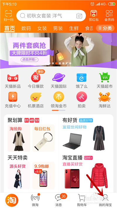 第二步,在淘宝首页,点击“我的淘宝”选项。