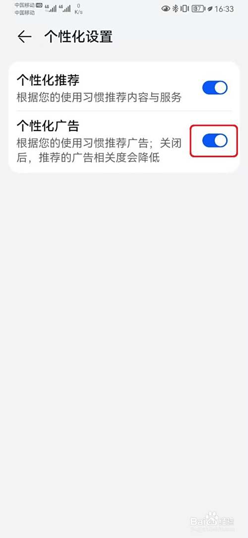 在个性化设置页面,关闭【个性化广告】开关即可。