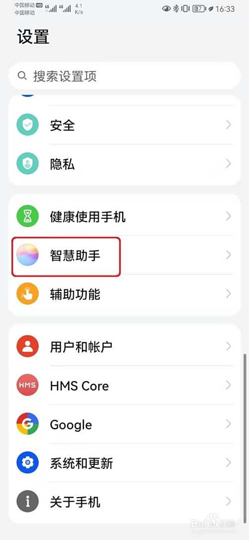在设置页面,打开【智慧助手】选项。