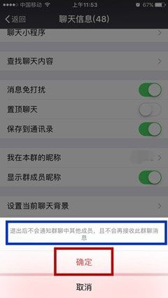 在弹出的对话框中,点击“确定”,就可以直接退出这个微信群了。