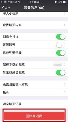 将“聊天信息”设置界面一直拉到最下方,点击红色按钮“删除并退出”