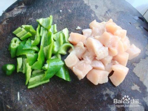 鸡胸肉切成小块,青椒去籽切成小块备用。
