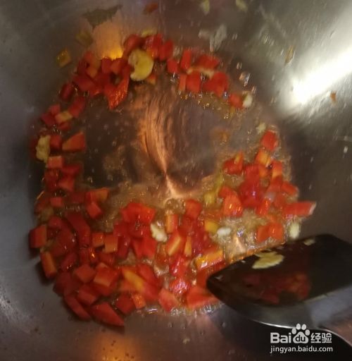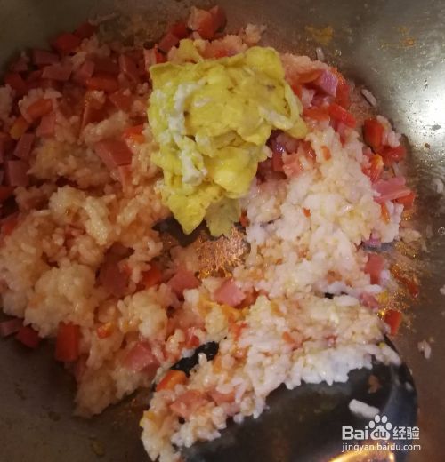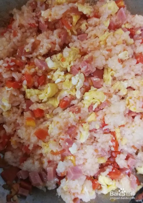继续在炒锅中倒入适量油,放入胡萝卜翻炒,接着加入火腿肠翻炒,最后加入西红柿碎翻炒。
