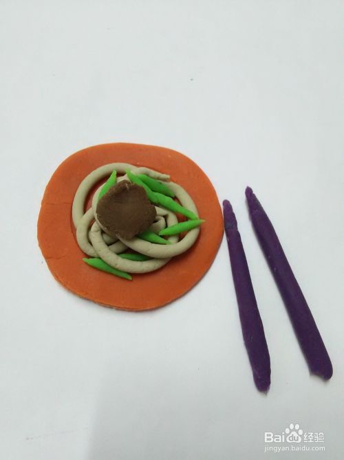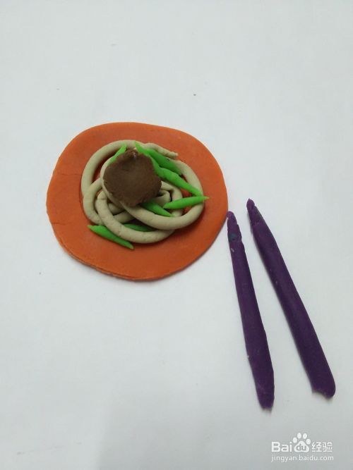 用紫色搓两个细长条,当作筷子,芭比就可以吃到美味的面条了。