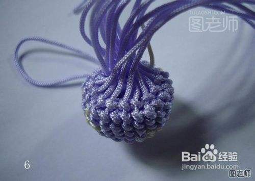 从头顶编起,6根50厘米的紫色线对折编六耳团锦结