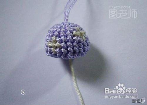 用钩针将6根30厘米白线对折加入第九圈、加在轴线上。(隔两个紫色的卷结加一根对折的白线)此时共12根白线