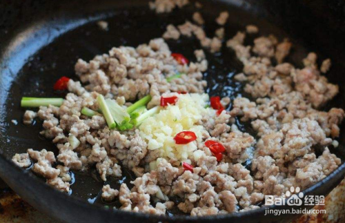 锅里面倒油大火烧热,把葱姜蒜末爆香(喜欢吃辣的,可以加辣椒),加入猪肉末继续翻炒,两分钟后倒入酱汁,再加入一勺料酒,翻炒三分钟,起锅备用