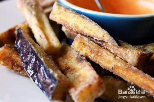 把用盐腌过的茄子,用手挤出多余的水分, 再把茄子拍上一层薄薄的淀粉,放入锅里,用油炸1分钟,炸好后把油滤干净