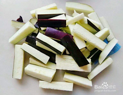选择长条的紫茄子,去蒂洗干净,切成手指宽的长条,装在容器中,撒上盐搅拌均匀,腌制20分钟
