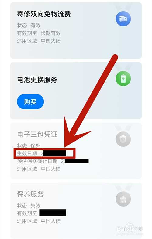 页面跳转后,找到电子三包凭证,就可以看到激活的时间。