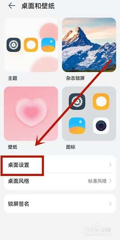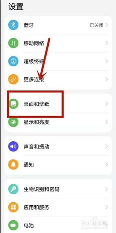 进入手机设置中,选择一下页面的桌面和壁纸选项。