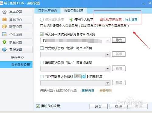 在个人版的设置中,可以选择客户第一条消息的问候语,忙碌、离开的自动回复和接待客户超过多少人的自动回复;