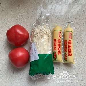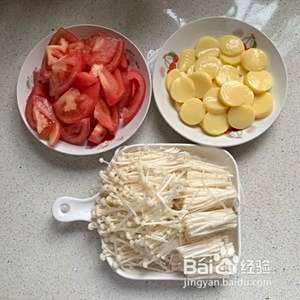 番茄切块,金针菇撕小条切段,鸡蛋豆腐从袋子中间对半切开,挤出来,再切成片。