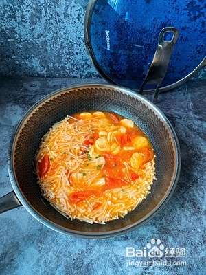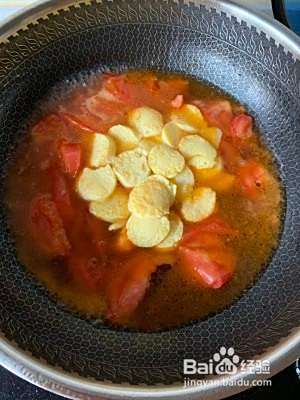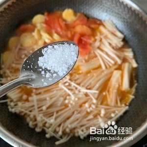 下番茄炒出汁水,倒入豆腐,煮开后倒入金针菇