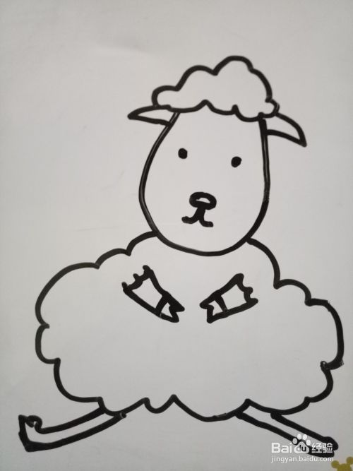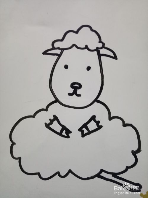 最后给小绵羊画上两只脚,尽量的像八字排开一点,坐立的小绵羊就画好了。