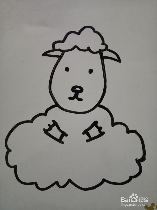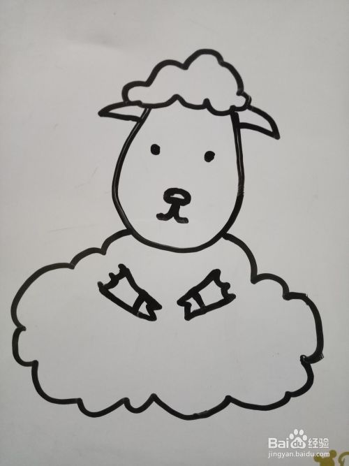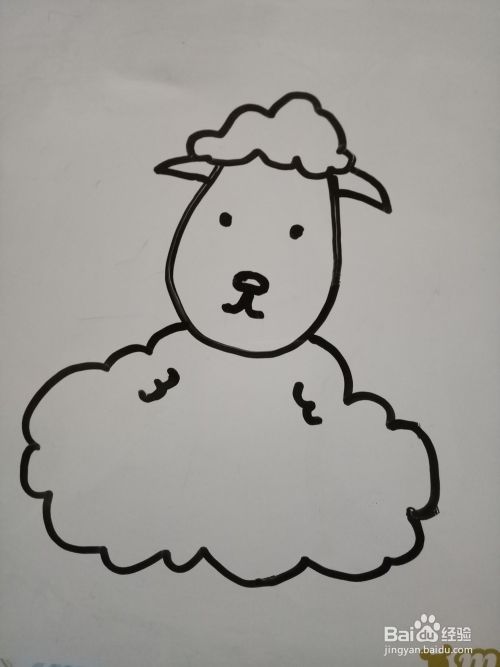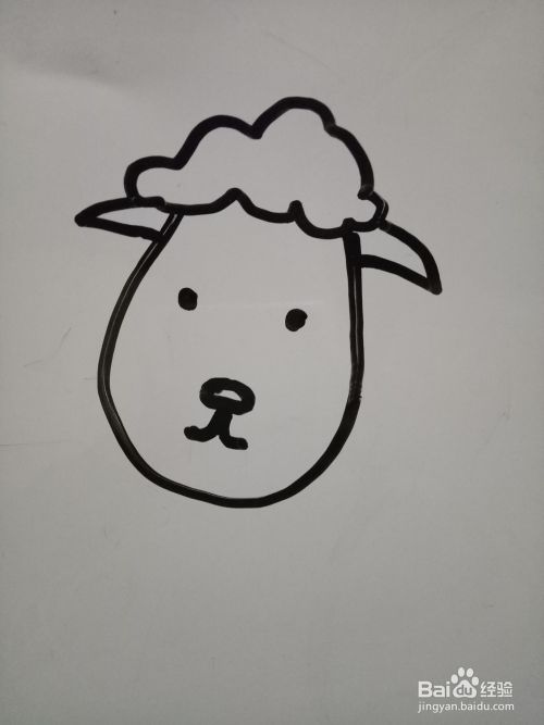 画一个像云朵一样的在小绵羊的头上,再给小绵羊画上两个尖尖的角。