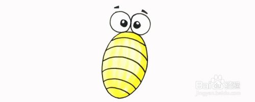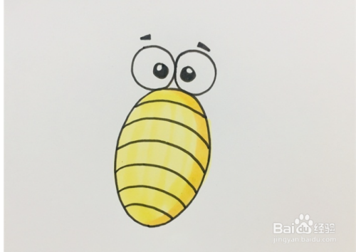 先画出毛毛虫的椭圆形虫茧轮廓,上方画出两个大眼轮廓,上面画出它的眉毛,接着留白眼睛上的高光区域,用黑色彩笔将瞳孔涂上颜色,再来将虫茧整体涂上黄色,右侧边缘位置加深黄色阴影,毛毛虫的茧就画好啦。