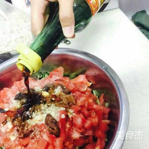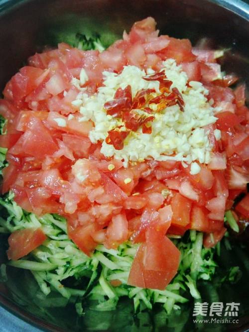 5将切好的西红柿,蒜末,辣椒片儿放在擦好的黄瓜条儿上。