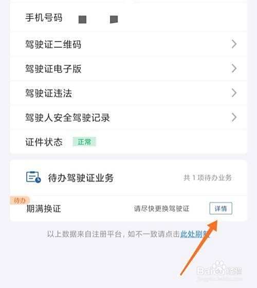 在页面底部找到【期满换证】,点击【详情】。