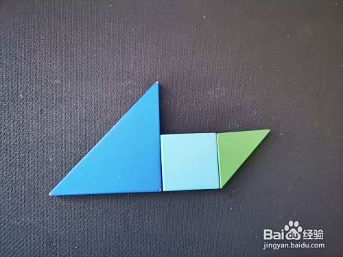 拿出一个咖啡色中三角形放在深蓝色大三角形的左边,如下图所示。