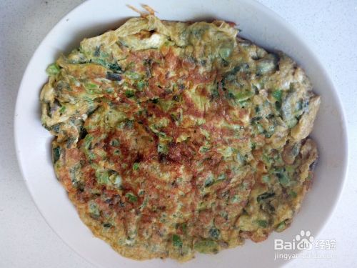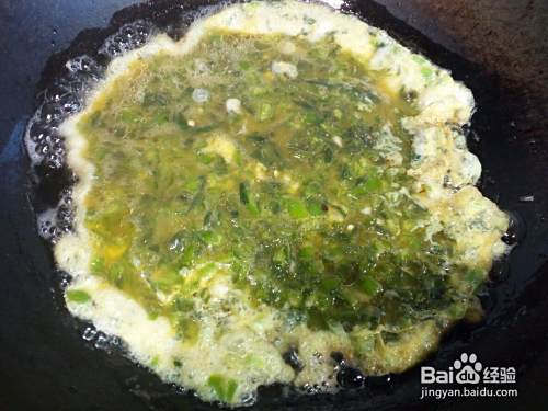 油热后倒入搅拌好的鸡蛋液,慢火煎塌。