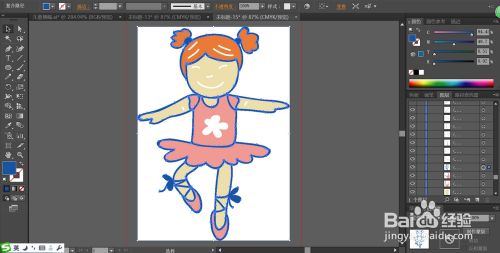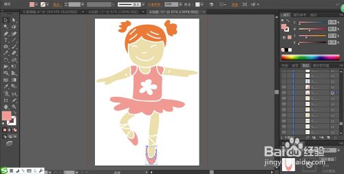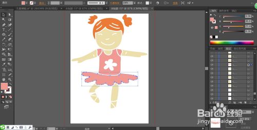 这一步画出女孩的双手与双脚,让跳舞的动作呈现出来,我们用黄色填充手部与脚部,再完成裤子的路径绘制并用淡粉色填充。
