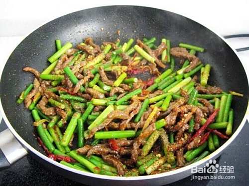 放蒜薹,炒到基本成熟后加胡椒面、辣椒面,翻炒均匀。最后放糖、盐和蚝油调味即可。