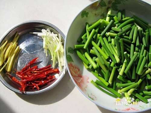 蒜薹去老茎后切段。葱姜切丝,干辣椒剪成丝。