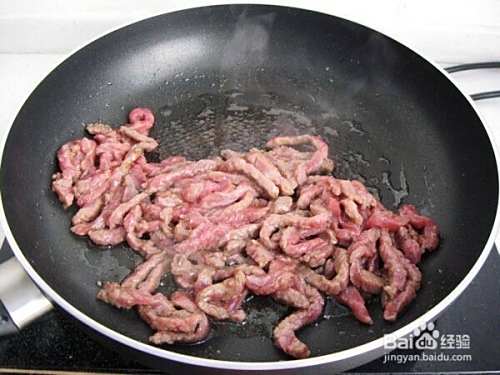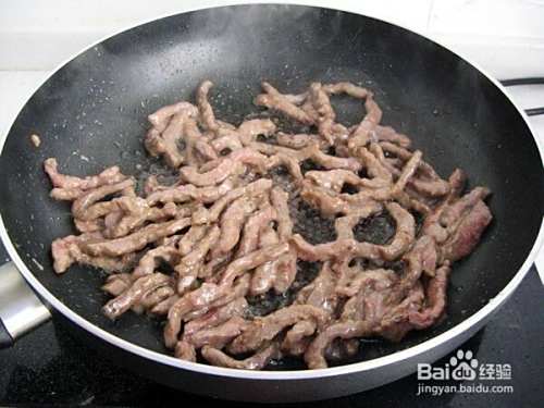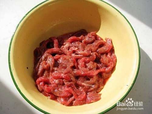 牛肉切丝,不要太细。加少许料酒、酱油、胡椒粉、盐,最后再加油抓匀。腌制20分钟。