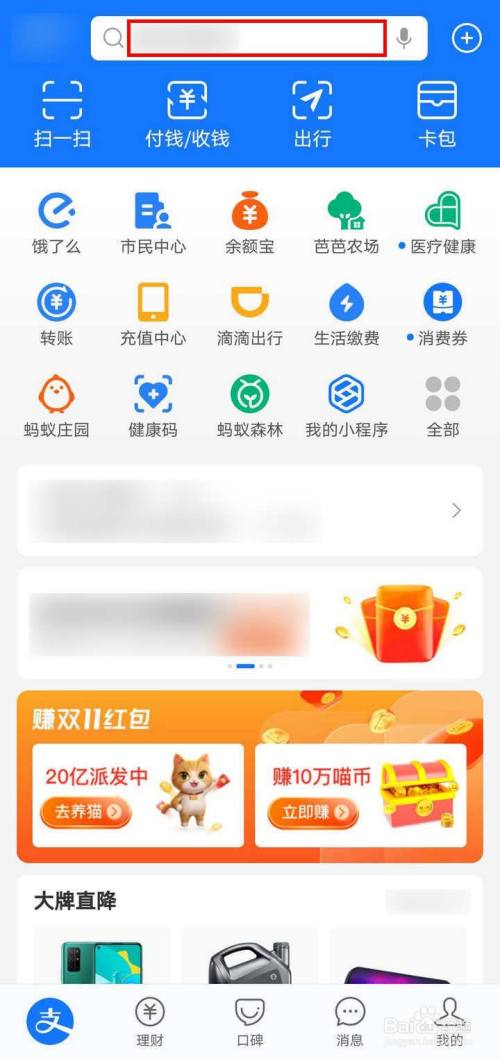 在手机里找到支付宝APP,点击打开,经常使用支付宝的大家的首页应用应该都不少,找应用的最好方式就是使用搜索功能,点击搜索框;
