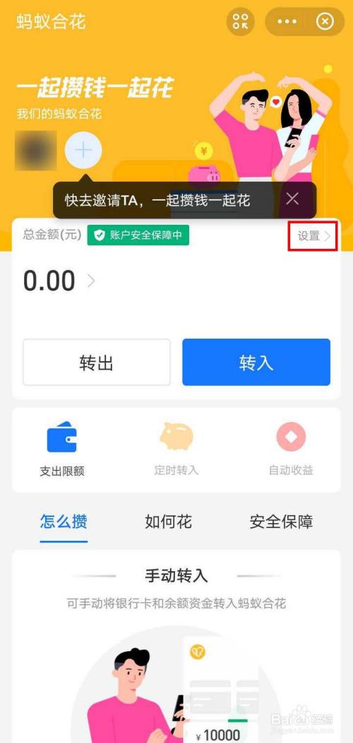 进入蚂蚁合花页面,显然是为两口子提供的服务,点击页面右侧的设置;