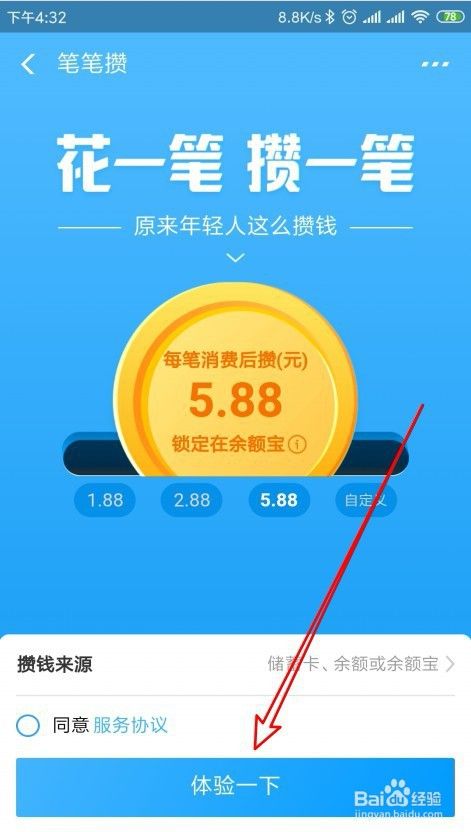 接下来在打开的笔笔攒详情页面中,我们点击同意协议,然后点击体验一下的按钮