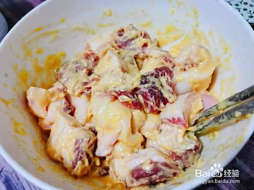 把鸡蛋打进碗里,面粉也倒进去。加盐,五香粉,蚝油搅拌均匀腌五分钟左右。
