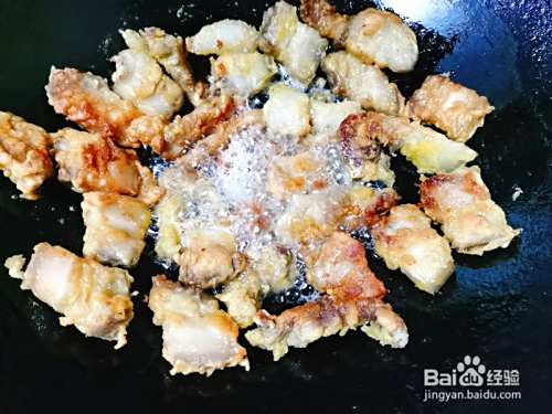 起锅热油,放稍多一点油,油温六成热时把腌好的五花肉放入锅,小火炸至金黄。