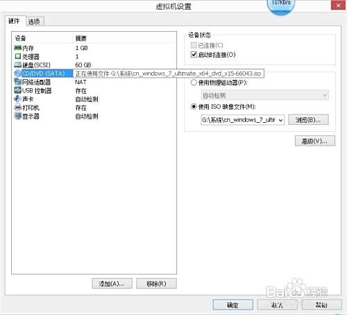 链接选使用ISO映像文件,然后浏览找到下载的原版win7系统文件。打开后确认,这样就可以开启虚拟机了。