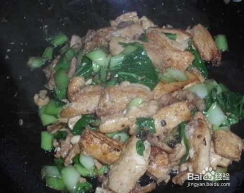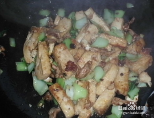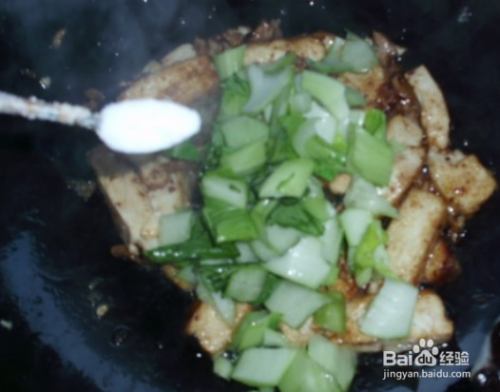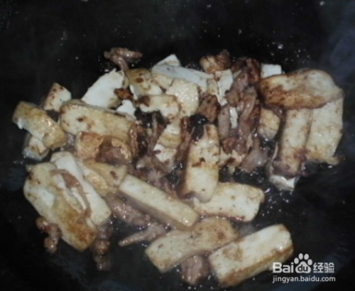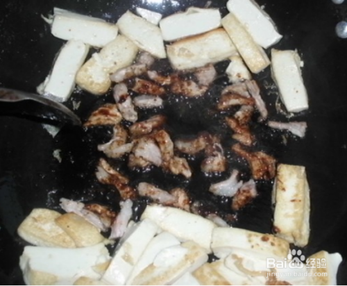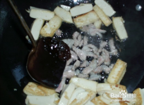 待肉色炒深红后再与豆腐同炒。