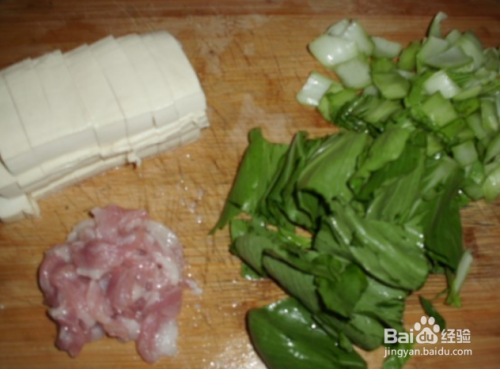 准备食材。温锅、温油、中小火,油里搁一点盐。(煎豆腐不粘锅)