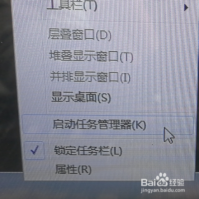看到右键点击出页面任务栏之后,我们就用鼠标在出现的列表里边选择启动任务管理器进行点击。