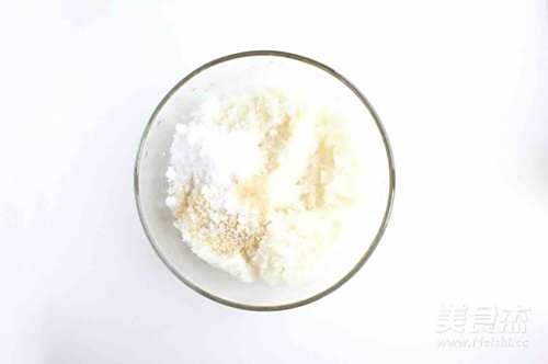 2取一个大碗加入蒸熟的白糯米,依次加入炒熟的白芝麻、糖、油搅拌均匀。