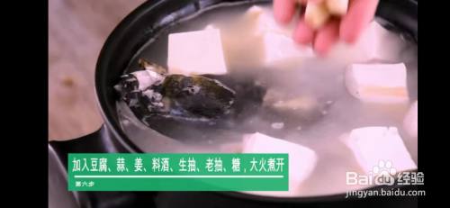 加入豆腐,蒜,姜,生抽,老抽,大火煮开。