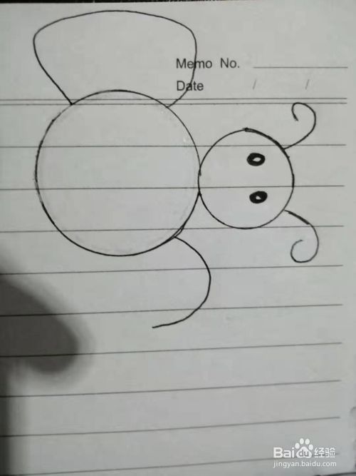 第四,在小圆里面,上半部分给蜜蜂画上两个眼睛,具体操作可以看图,很简单的,就是画两个小圆,并用水笔涂黑即可,同时在两只眼睛下方画上一个嘴巴。