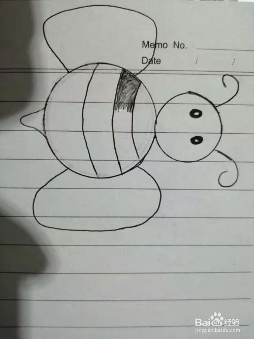 第七,最后,在蜜蜂的翅膀两边,如下图所示,分别画上两个弧线,这样一只可爱的小蜜蜂就画好了,非常简单,一学就会哦。
