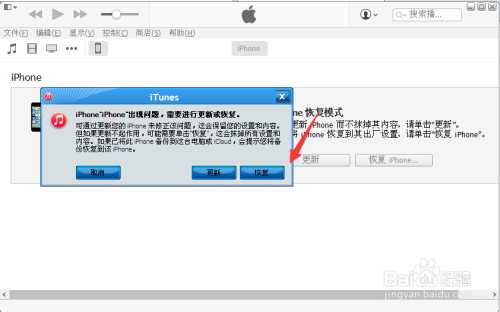 此时如果在电脑iTunes检测到一台处于恢复模式的iPhone,则表示已经进入DFU模式,点击恢复按钮,在按一下键盘上面的shift键,点击恢复iPhone,选取自己所下载苹果8固件提取恢复即可。