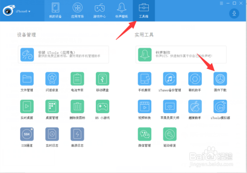 然后就是下载苹果系统固件,固件下载在这里要注意一下,下载时不能低于当前手机系统版本的固件,可以高于当前系统版本或者是最新的系统固件。具体下载固件可以在iTools软件上面下载,打开iTools工具箱—固件下载。