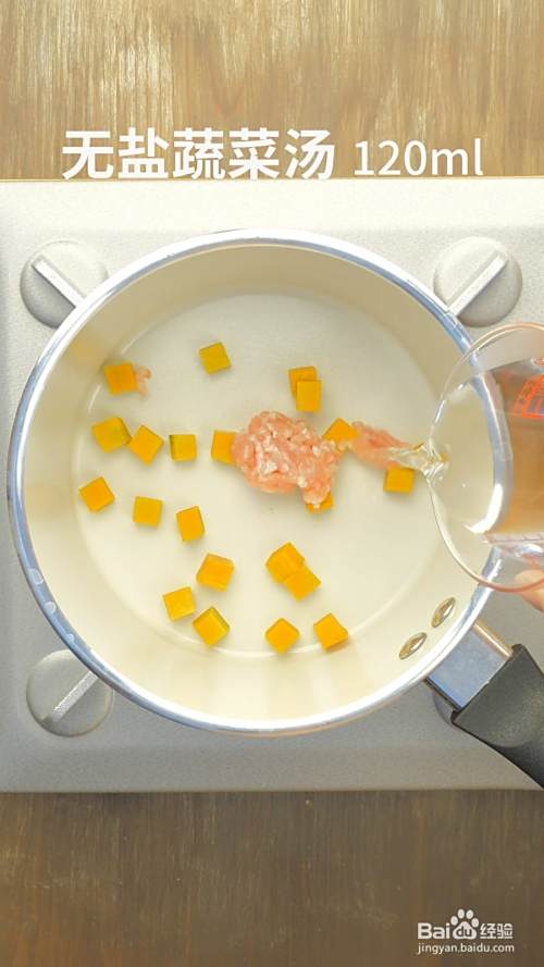 再加入无盐蔬菜汤。贝贝粒的无盐蔬菜汤是要把适量的包菜、萝卜、洋葱等新鲜蔬菜洗净后切小块,下锅煮开转慢火煮30分钟后,过滤掉蔬菜取汤即可。另外无盐蔬菜汤可以用来调味,但不能给宝宝单独喂。